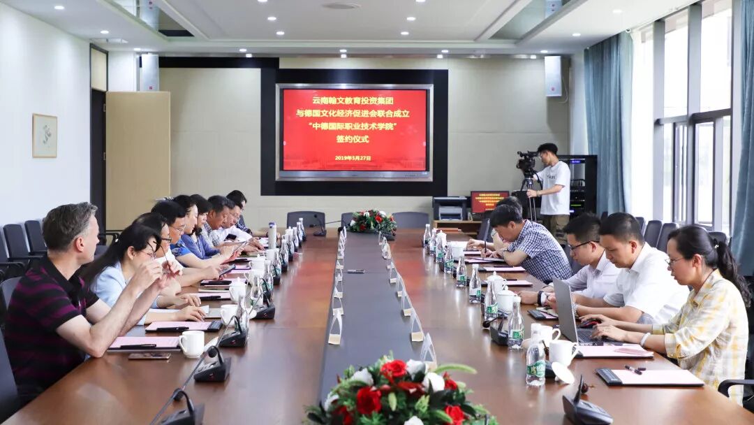 5月27日,云南翰文教育与德国文化经济促进会在康养实训中心举行“中德国际职业技术学院”签约仪式。云南省教育厅对外交流与合作处王涛、魏蓝,德国文化经济促进会主席埃哈特·劳(Erhard Rau)先生及理事长孙岩女士,云南翰文教育投资集团董事长杨红卫,董事长助理王丽、杜安睿,云南经济管理学院校长侯德东,云南医药健康职业学院院长章杨杰,云南理工职业学院院长张云钢等领导和嘉宾出席了此次签约仪式。签约仪式由集团副总裁刘相主持。